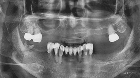 장기간 틀니 사용으로, 씹는 힘이 제대로 전달되지 않아 잇몸뼈가 흡수되고 약해졌을 때